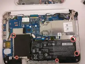 Удалите пять 1 мм винтов, соединяющих аккумулятор с корпусом компьютера, с помощью отвертки Phillips #0.