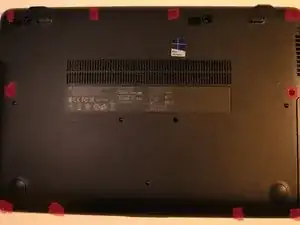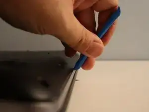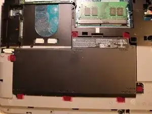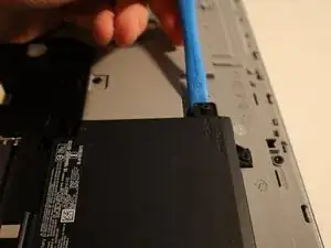 После удаления винтов вы можете использовать вкладку, ближайшую к центру передней панели ноутбука, чтобы поднять аккумулятор вверх и вытянуть его