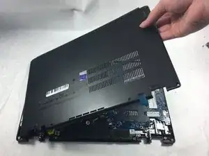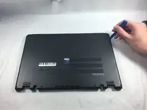 Используя пластиковый инструмент для открытия, подденьте нижнюю крышку ноутбука.