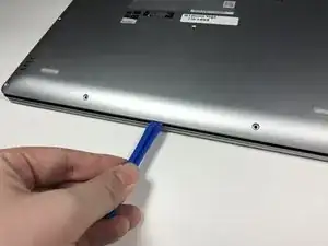 Используйте пластиковый инструмент для открытия, чтобы приподнять крышку и удалить ее с ноутбука, начиная с одного края и обходя вокруг крышки.