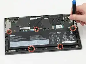 Удалите пять винтов Phillips #0 размером 4,60 мм, крепящих аккумулятор к корпусу.