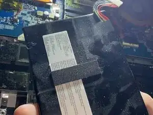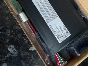 Для извлечения аккумулятора используйте неострый металлический монтажный инструмент или медиатор, чтобы поддеть батарею и вынуть её. Основной клей находится в центре платы, а не со стороны разъёма. Не прикладывайте силу и не сгибайте аккумулятор, так как это может повредить ячейки и создать опасность. После этого аккумулятор легко вынется.