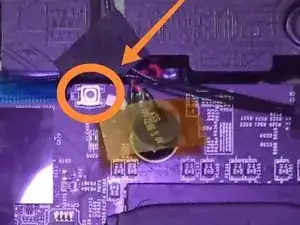 Если после этого система загружается, а проблема не решена, найдите кнопку сброса на плате рядом с разъёмом зарядки/индикатором питания. Кнопка нажимается иглой, если корпус установлен, при снятом корпусе она выглядит как на изображении.