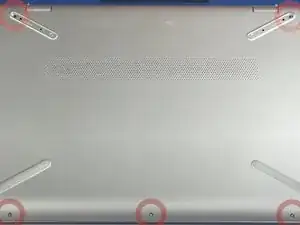 Открутите 5 винтов P1 Philips (2 из-под резинок). Вы можете легко следовать: официальному видео HP для снятия нижнего корпуса.