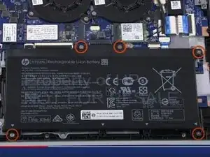 Если у вас есть замена, открутите 5 винтов P1 Philips. На верхней части будет разъем, который вам нужно отключить, чтобы снять батарею. Вы можете следовать официальному видео HP, чтобы снять батарею.