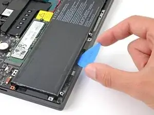 Вставьте лопатку для открытия между рамой и нижним левым краем аккумулятора.