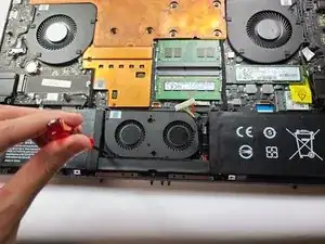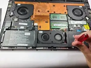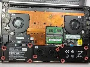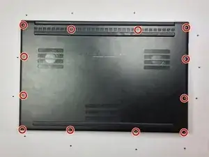 С помощью крестовой отвертки Philips #1 открутите 10 винтов, фиксирующих аккумулятор и узел вентилятора.