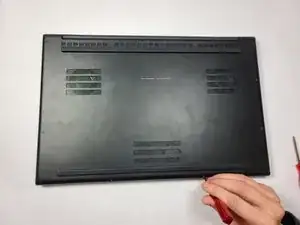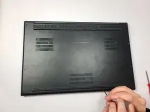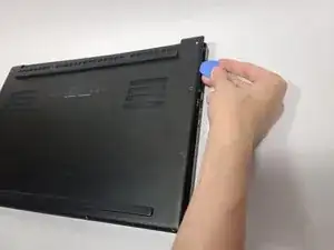 Вставьте лопатки для вскрытия в зазор между задней панелью и корпусом ноутбука и отожмите по периметру, пока нижняя крышка не освободится.