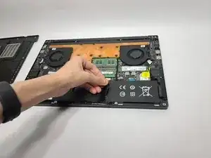 Поднимите узел вентилятора и аккумулятор и выньте их из шасси.