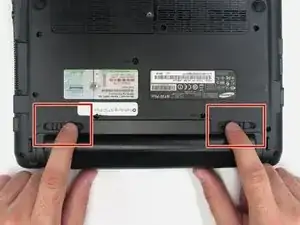 Удерживая левые и правые фиксаторы в положении «разблокировано», сдвиньте аккумулятор от корпуса компьютера.