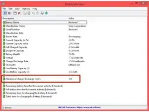 Например: BatteryInfoView показывает, что «Number of charge/discharge cycles» равен 0 (красная рамка), что указывает на то, что ноутбук распознаёт батарею как новую.