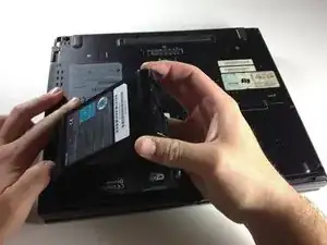 Одной рукой удерживайте рычаг разблокировки аккумулятора.
