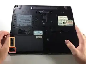 Сдвиньте рычаг разблокировки аккумулятора в направлении стрелки, чтобы отсоединить аккумулятор.