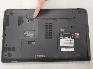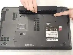 Поддев за небольшой выемке между двумя защёлками, вытащите аккумулятор из ноутбука.