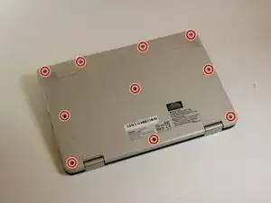 Открутите 10 винтов Phillips размером 5 мм, расположенных на нижней стороне ноутбука, с помощью бит PH1 и магнитной отвертки.