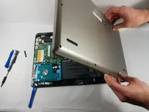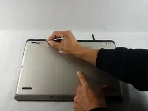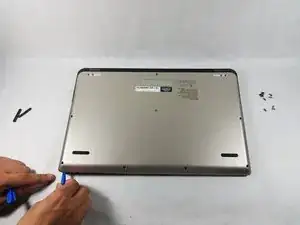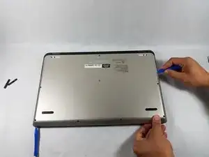 Начните с края, противоположного петле, используйте пластиковые инструменты для открытия, чтобы приподнять заднюю крышку от компьютера.