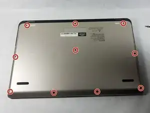 Удалите десять винтов Phillips #0 длиной 5 мм, которые крепят заднюю крышку к компьютеру.