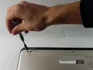С помощью металлической лопатки удалите две резиновые накладки на нижней поверхности ноутбука, расположенные ближе всего к петле.