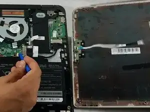 Откройте заднюю крышку к кнопке питания, но будьте осторожны, чтобы не потянуть за шнурок, соединяющий заднюю крышку с материнской платой.