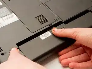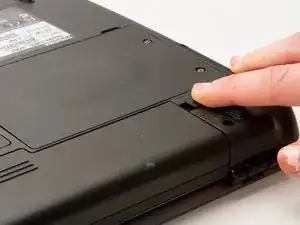 Поверните ноутбук на 180 градусов так, чтобы аккумулятор был ближе к вам.