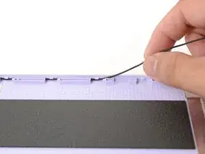 Пальцами поднимите черную пластиковую петлю, фиксирующую антенный кабель, рядом с вентиляционными отверстиями у левого шарнира.