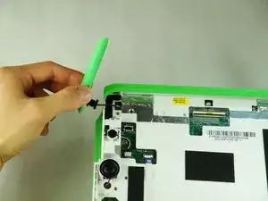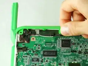Снимите зеленую боковую панель, нажав на маленькую зеленую кнопку сверху и сдвинув панель вверх.