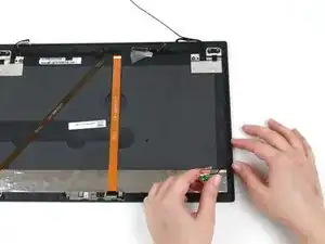 Возможный риск повреждения устройства: кабель дисплея всё ещё соединяет панель дисплея с остальной частью сборки, поэтому переворачивайте панель аккуратно.