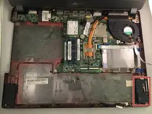 Аккуратно поднимите черные кабели, которые все еще соединены с материнской платой в нижнем левом углу корпуса ноутбука.