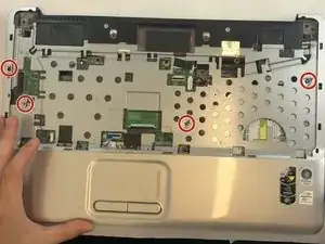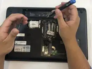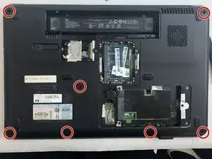 Отвинтите семь винтов 4,0 мм крестовой отвёрткой Phillips #0 на нижней стороне ноутбука.