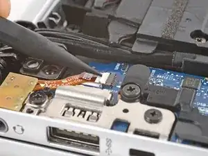 Используйте лопатку, чтобы приподнять запирающий откидывающийся язычок на ZIF‑разъёме аудиоразъёма, расположенном в верхнем левом углу ноутбука.