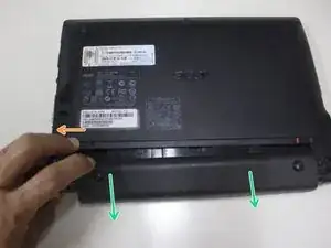 Разблокируйте батарею, сдвинув указанный замок вправо. Красный индикатор покажет, что она разблокирована.