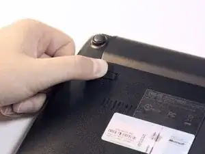 Используя палец, надавите и удерживайте штифт, отмеченный "2", на ноутбуке из положения блокировки в положение разблокировки.