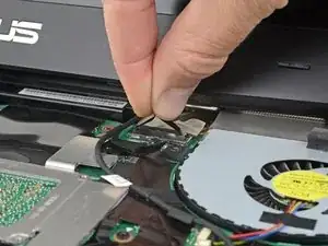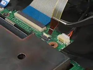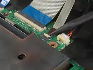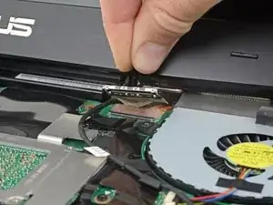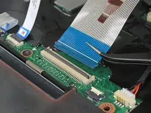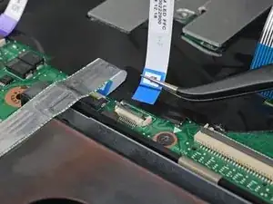Используйте кончик лопатки, чтобы приподнять маленький фиксирующий заслонку разъёма ZIF кабеля подсветки клавиатуры.