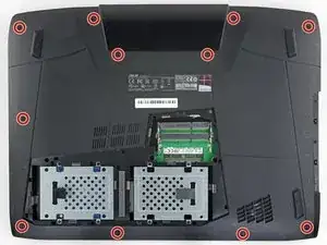 Используйте кончик лопатки, чтобы извлечь одинадцать резинок, закрывающих винты на дне ноутбука.