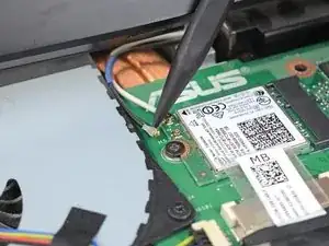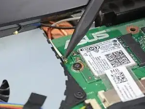 Подсуньте конец лопатки под черный антенный кабель, пока он не станет плотно прилегать к разъему, и поднимите прямо вверх от платы, чтобы отключить антенный кабель.