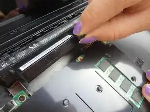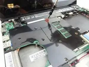 Используйте отвертку Phillips #00 для удаления черного винта длиной 4.7 мм, удерживающего батарею на месте.