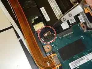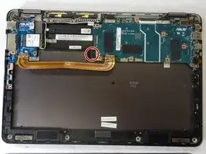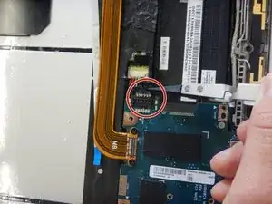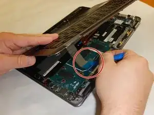 Используйте пластиковый инструмент для открытия, чтобы отсоединить ленточный кабель клавиатуры с ZIF-разъёмом от материнской платы.
