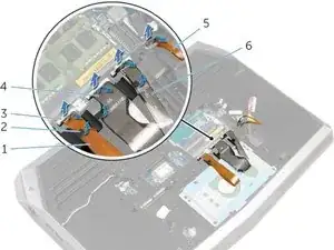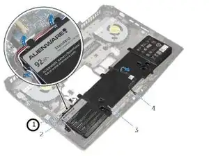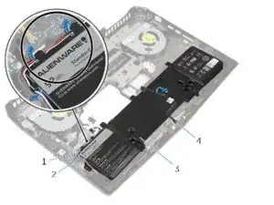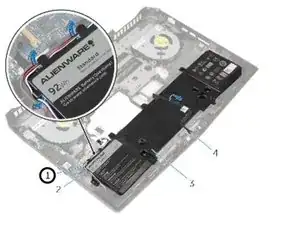 Обратите внимание на прокладку переднего кабеля светодиодов AlienFX и отклейте кабель от аккумулятора.