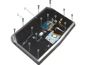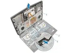Замена батареи Alienware 15 включает в себя снятие модулей памяти, твердотельных накопителей и подставки для ладоней.