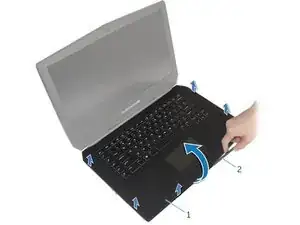 С помощью пластиковой лопаточки подденьте по краям узел подставки для ладоней. После того как подставка для ладоней перестанет быть прикреплена к компьютеру защёлками, попытайтесь поднять узел подставки для ладоней.
