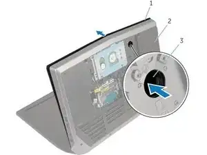 После того как передняя часть будет приподнята немного, сторона панели без винтов потребуется сдвинуть вперёд немного, чтобы завершить извлечение нижней крышки из компьютера.
