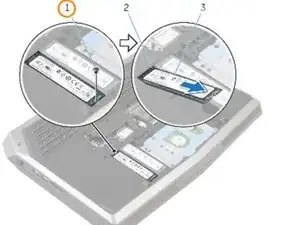 С помощью пальца или отвертки нажмите внутрь отверстия для фиксации подставки для ладоней (#3 на изображении 1), чтобы отсоединить подставку для ладоней от защёлок, удерживающих её.