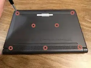 Удалите 7 видимых винтов с крестообразной головкой с нижней крышки устройства