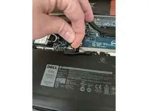 Используя язычки, потяните вверх и отключите разъем батареи от материнской платы.