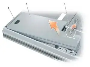 Сдвиньте и удерживайте защёлку отсеков батареи на дне компьютера, а затем выньте батарею из отсека.
