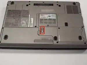 Переверните ноутбук и найдите защелку для слайда батареи. Переместите переключатель и аккуратно поднимите батарею.