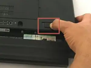 Используя большой палец, переместите вкладку вправо для разблокировки батареи, одновременно другой рукой сдвиньте батарею наружу.