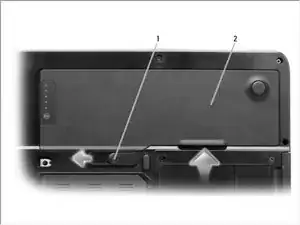 Сдвиньте и удерживайте защелку для освобождения отсека батареи на дне ноутбука, затем поднимите батарею из отсека.