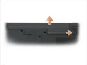 Сдвиньте защелку освобождения отсека батареи, расположенную ближе к боковой стороне компьютера, а затем извлеките батарею из отсека.