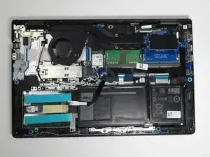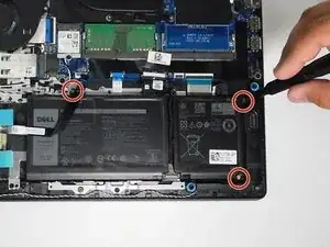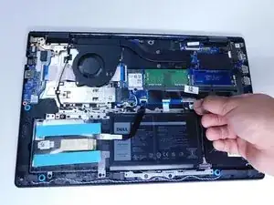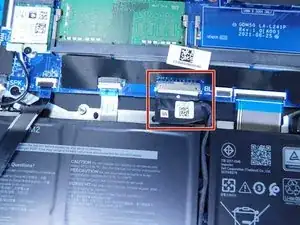 Удалите кабель батареи с материнской платы, осторожно потянув за черную ленту, прикрепленную к шлейфу.